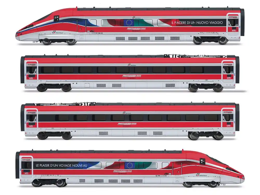 FS Trenitalia, 4-tlg. Grundset des Hochgeschwindigkeitszugs „Frecciarossa 1000″, mit „Le plaisir d’un voyage nouveau“-Werbung, Ep. VI, mit DCC-Decoder