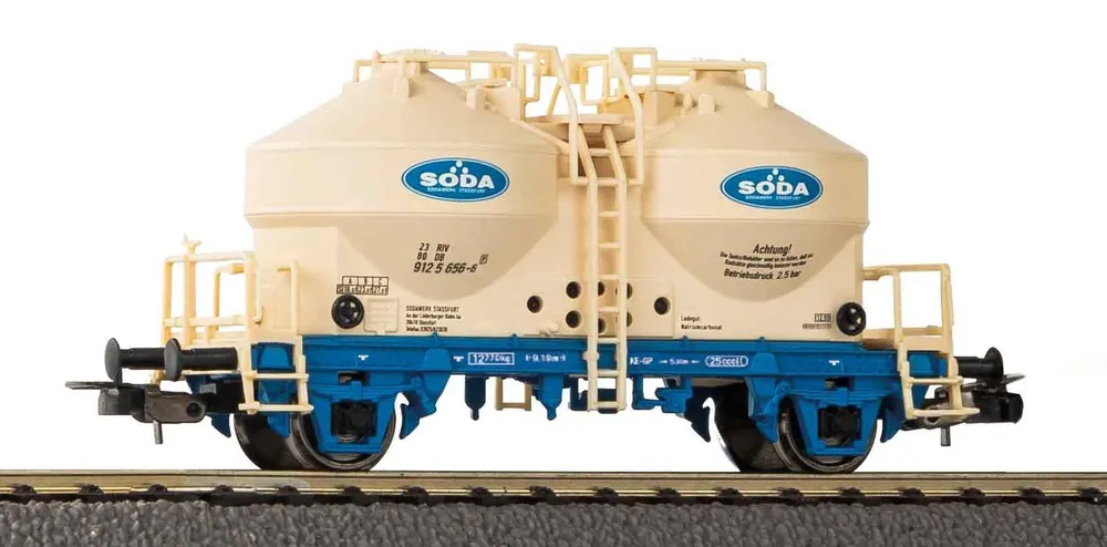 Zementsilowagen des Sodawerks Staßfurt in Epoche V. Das Wagenmodell verfügt über zahlreiche Details, eine konturenscharfe Bedruckung und überzeugt durch hervorragende Rolleigenschaften.