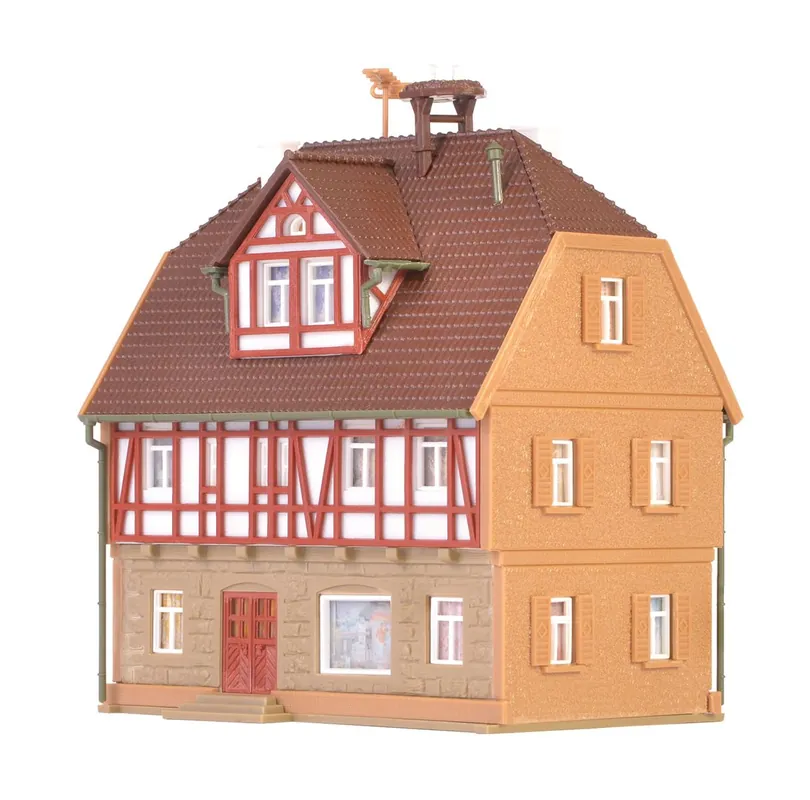 Auf dem Dach dieses romantischen Fachwerkhauses hat sich ein Storch niedergelassen.