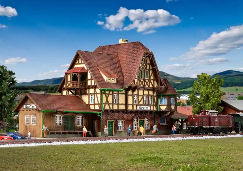Der Bahnhof Neuffen ist ein typischer Landbahnhof. Er ist Endstation der Nebenlinie Nürtingen-Neuffen und steht am Fuß der Burgruine Hohen-Neuffen auf der Schwäbischen Alb. Das kurz vor der Wende zum 20. Jahrhundert errichtete, stilechte Bahnhofsgebäude wurde von Vollmer mit allen Details nachgebaut. Maße: L 26,5 x B 10 x H 11,5 cm.