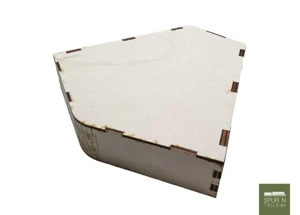 Lasercut-Bausatz eines kompakten 45°-Modulkastens zur Realisierung engerer Streckenbögen im Maßstab 1:160 (Spur N). Die Bauform eignet sich besonders für platzsparende Modulaufbauten und geschwungene Streckenführungen mit kleineren Radien.
