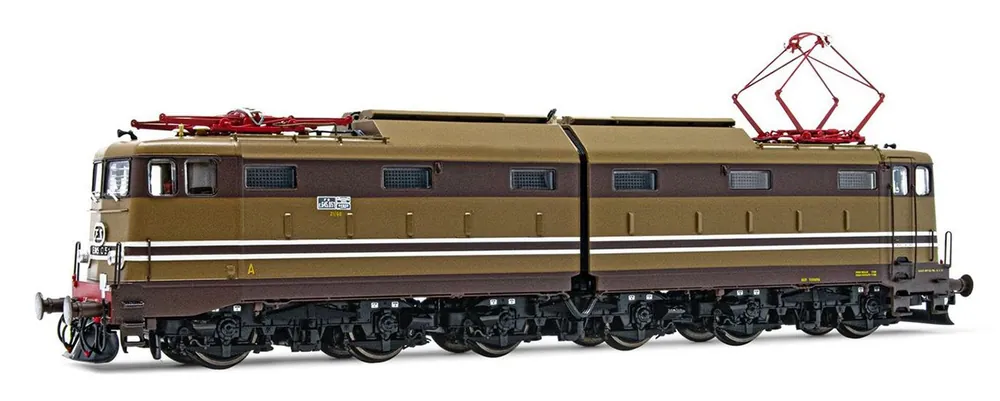 FS, schwere sechsachsige Elektrolokomotive der Reihe E.645 in „Castano/Isabella“-Farbgebung mit Aluminiumzierstreifen, schwarzen Drehgestellen und großen Trittstufen, Ep. IV