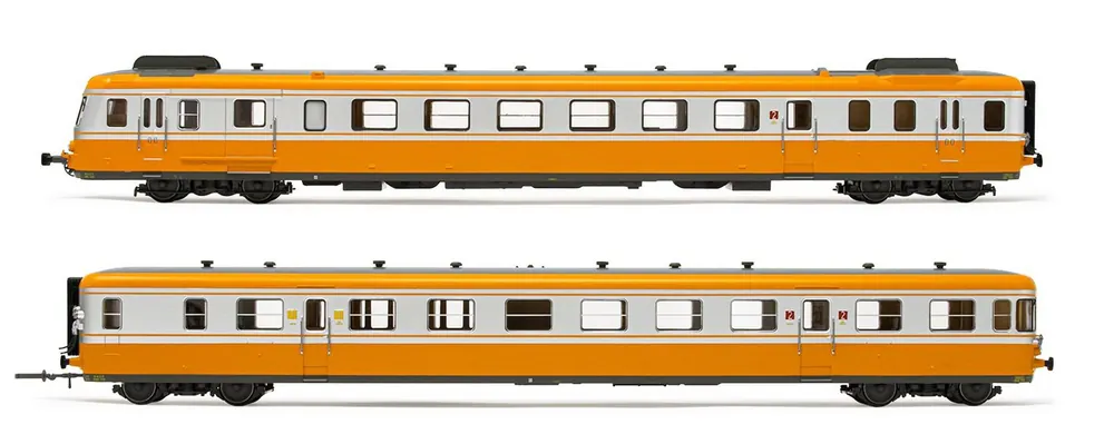 SNCF, Dieseltriebwagen RGP2, Trieb- und Beiwagen in modernisierter Ausführung, orange-silberne Farbgebung, Ep. IV