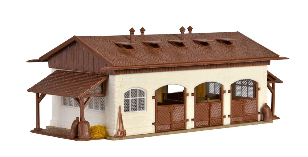 4 Pferde liegen dem Bausatz bei. Das Dach des Stalls ist abnehmbar. So kann das Innere nach Belieben gestaltet und verändert werden.