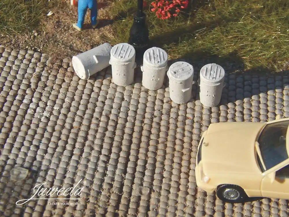 Abfalltonnen aus Zinkblech wie sie in Epoche 2 bis 3 an jeder Straßenecke zu finden waren – und natürlich auch auf dem Spur H0 Diorama.