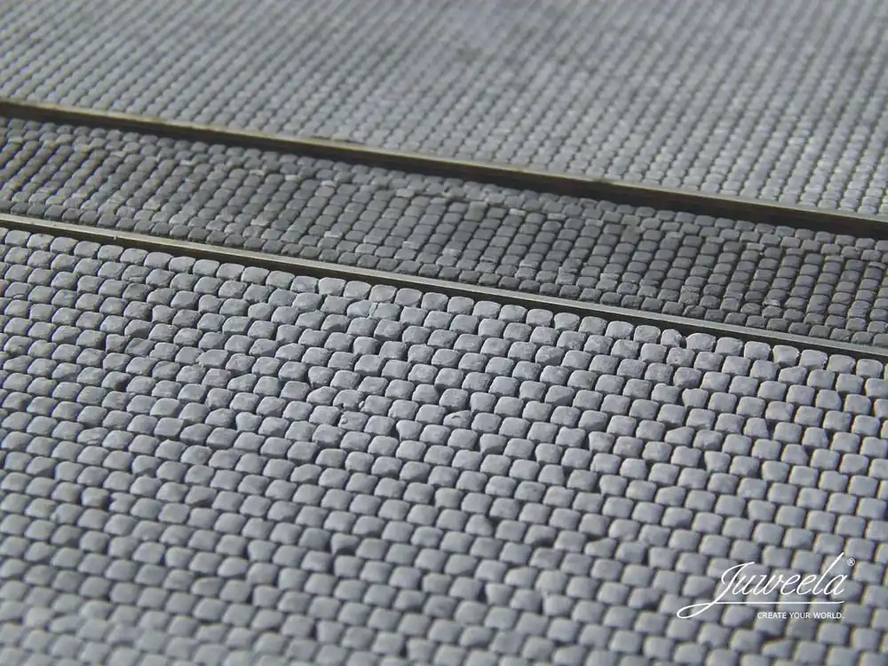 - 6 Streifen/Segment mit einzelnen Steinen mit durchgehender Fuge (ohne Anbindung untereinander)biegsames Trägermaterial macht das Segment in-sich-selbst-flexibel