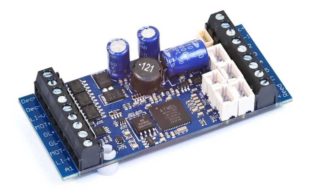 Leistungsfähiger 3 Ampere Sounddecoder (bis zu sechs Audiokanäle) mit 13 Funktionsausgängen, geeignet für bis zu zwei Motoren.