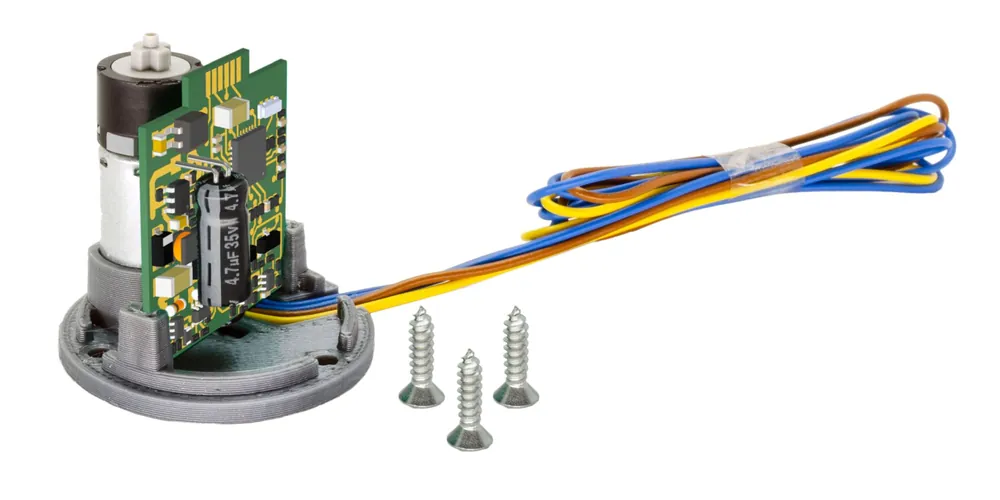 Kraftvoller, geräuscharmer Antrieb für die Motorisierung der handbetätigten 2/3-Wege Abzweigung (Art. 8445). Mit einem starken 10 mm Motor und Planetengetriebe gewährleistet er sichere Stellbewegungen. Durch das Umstecken der variablen Endanschläge lässt sich ein Links-, Rechts- oder 3-Wege-Abzweig flexibel erzeugen. Die kompakte Elektronik ist im Gehäuse integriert. Die Steuerung erfolgt manuell, über Taster/Schalter, den IR Traffic (Art. 8404) oder den InduktivCharger (Art. 8408), was digitale Steuerung ermöglicht.