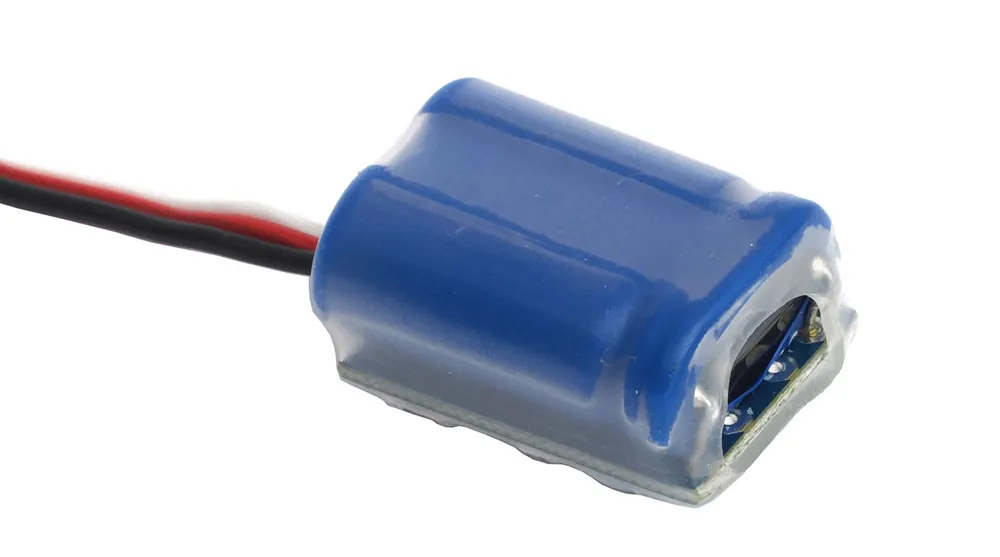 Dieser extrem kleine Powercap ist auch für kleine, einmotorige Modelle, bis hin zu Feldbahnloks geeignet und puffert einige Sekunden – ausreichend um eine kleine Lok über eine schmutzige Gleisstelle zu bringen