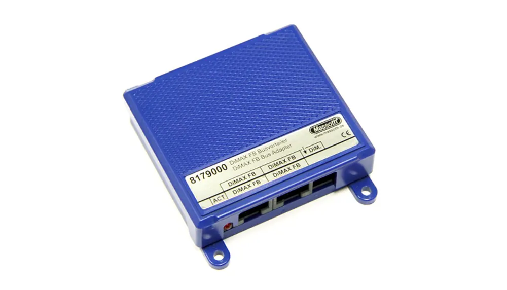 Der DiMAX FB Busverteiler ist auf einen einfachen Nenner gebracht eine Mehrfachsteckdose für den Massoth DiMAX FB Steuerbus. Im Vergleich zum DiMAX Steuerbus arbeitet der DiMAX Feedback Bus mit abgeschirmten CAT Netzwerkkabeln. Der Busverteiler bietet vier frei zugängliche DiMAX FB Busbuchsen (8-polig). Zusätzlich befindet sich im Inneren des Gehäuses eine klassiche (6-polige) DiMAX Busbuchse. Darüber lässt sich das neue DiMAX FB Bussystem auch an Digitalzentralen ohne DiMAX FB Bus anschließen. Eine separate Spannungsversorgung ist nicht notwendig.