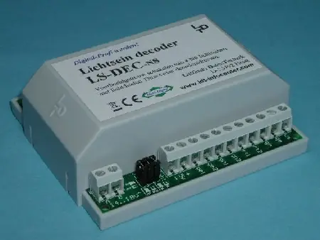 Lichtsignal-Decoder für 4 LED-bestückte NS-Signale mit 2 oder 3 Lampen plus Unterzahl. Mit freiprogrammierbarer Adresse und externer Versorgungsmöglichkeit.