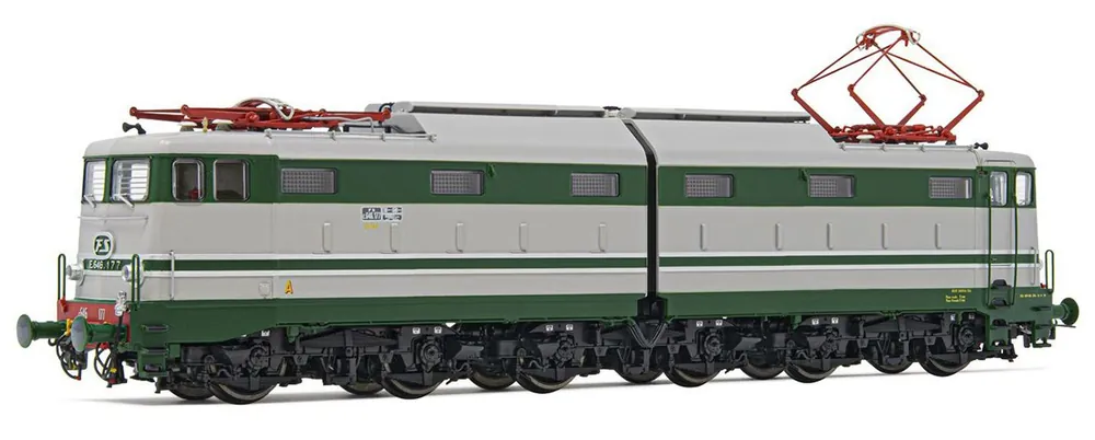 FS, schwere sechsachsige Elektrolokomotive der Reihe E.646 in grün-grauer Farbgebung mit Aluminiumzierstreifen, schwarzen Drehgestellen und großen Trittstufen, Ep. IV