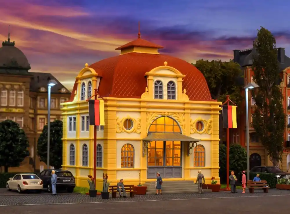 Dieses imposante Gebäude dient als Botschaftssitz. Dem Bausatz liegt die praktische und variable Etageninnenbeleuchtung von Viessmann bei. Diese bietet unbegrenzte Möglichkeiten zur individuellen Beleuchtung von Gebäuden mit großen Fensterfronten. L 12,6 x B 12,5 x H 16,7 cm.
