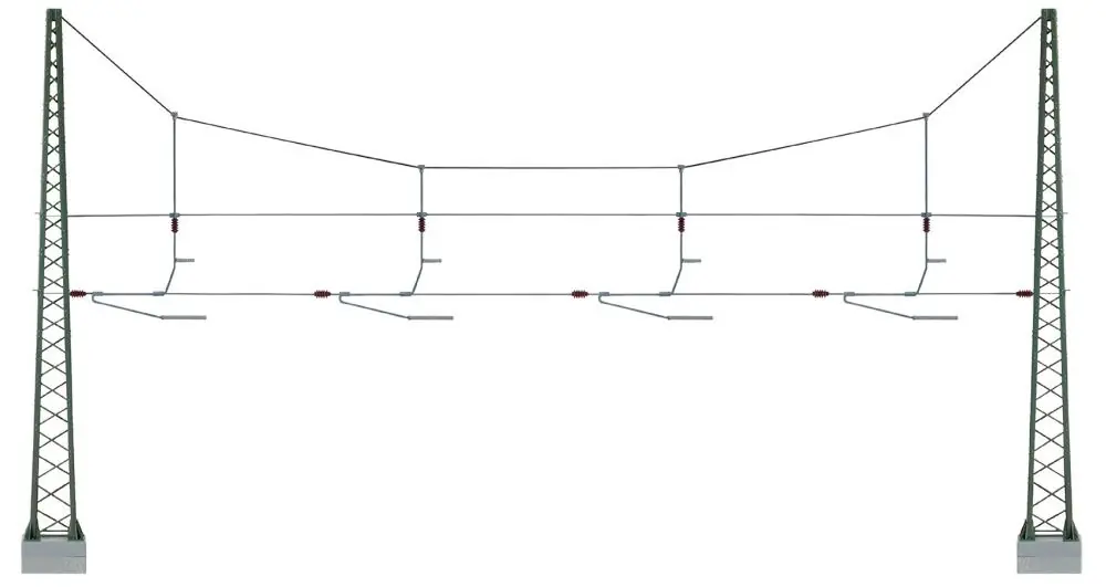 Komplett montiert und lackiert. Die Gleisabstände sind beliebig wählbar und die 4 Gleise sind elektrisch getrennt. Filigrane Metallausführung mit eingeprägten Nietenimitationen. Maximaler Mastmittenabstand: 31,25 cm, Höhe: 17 cm.