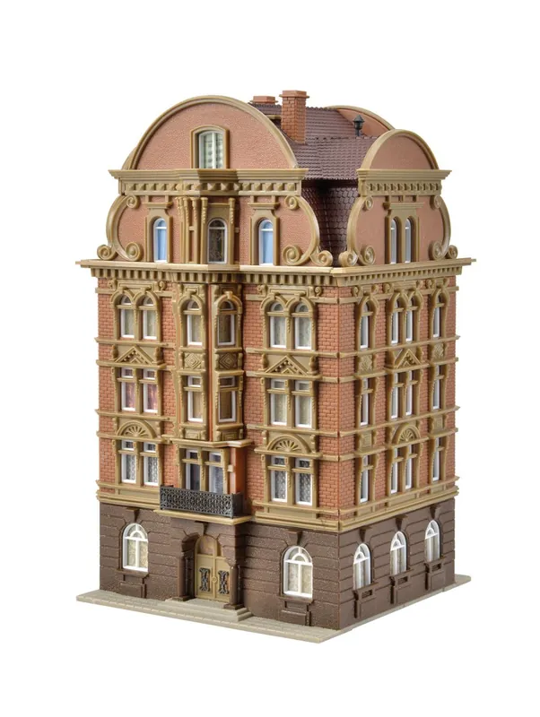 Dieses Modell ist so konstruiert, dass jede Seite eine Sichtseite darstellt. So können Sie z. B. 2 Häuser direkt nebeneinander stellen und sie wirken doch verschieden. Das Gebäude ist mit vielen Details ausgestattet, z. B. Eisengitterverzierungen, zierlichen Balkonen, Stuckfassaden und vielem mehr.